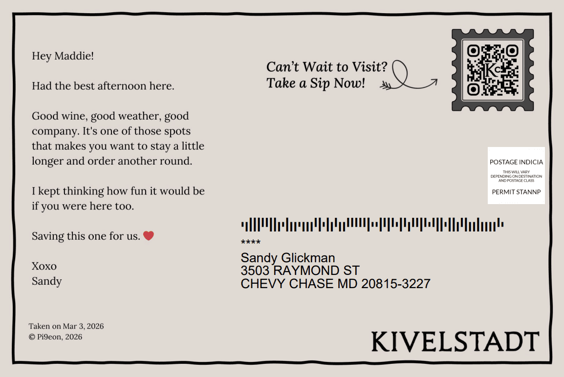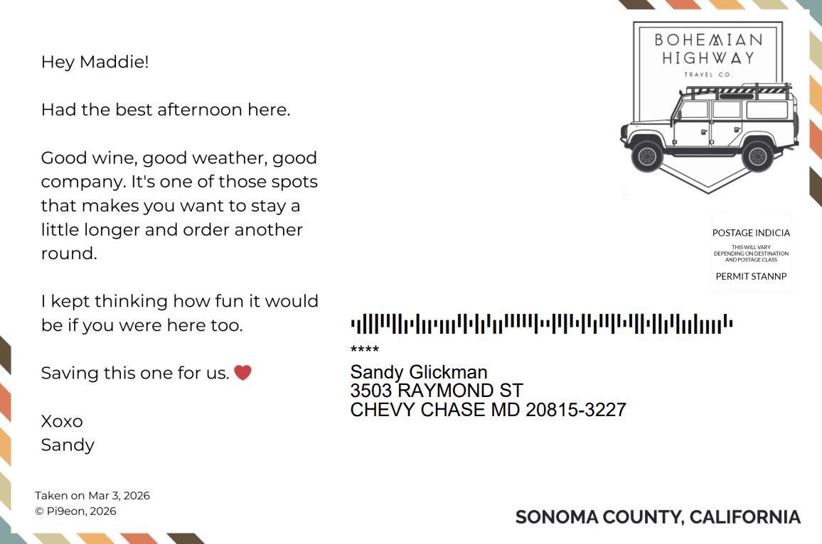 Pick a photo, add your note, and make your postcard — all without leaving the chat.